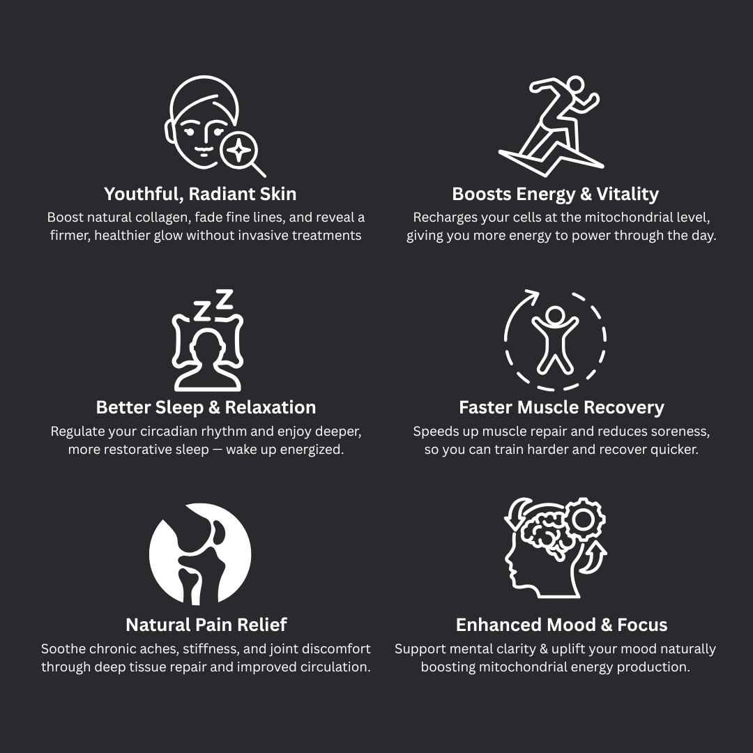 Near-Infrared Light (810–850nm): Penetrates deep into muscles, joints, and tissues to reduce pain, inflammation, and stiffness, and accelerates recovery.