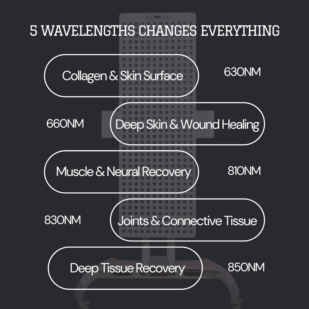 The Modouge Pro delivers five therapeutic wavelengths through premium dual-chip LEDs—engineered for the person who takes recovery, performance, and longevity seriously.